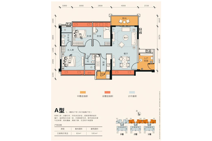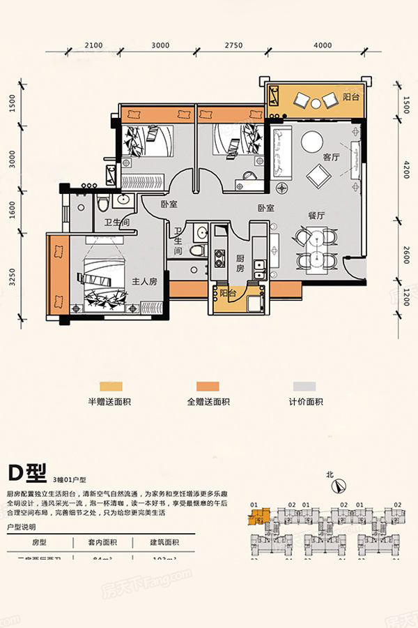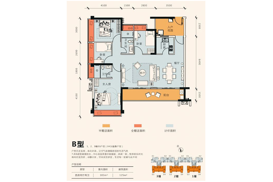 整体户型方正,活动区域开阔,居住舒适度高;客厅、主卧非南向或东向;居室布局合理,通风良好,动静分离,兼顾到了卧室和卫生间的私密性;客厅、卧室、卫生间和厨房等主要功能间的尺寸以及比例适中,有利于采光和通风,居住起来舒适、方便;公摊小,得房率较高。