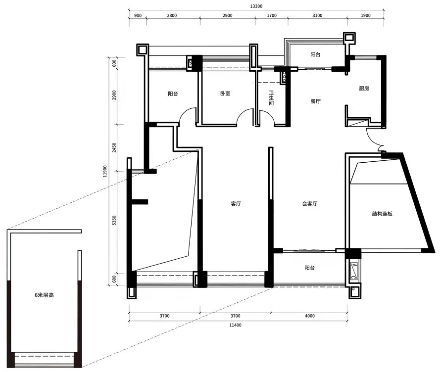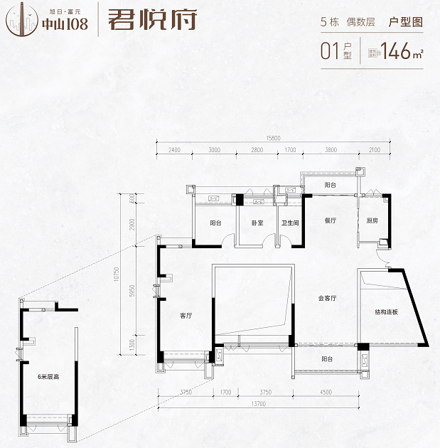 6米挑高,品质精装,赠送率高,独特复式设计 客厅、餐厅一体化,南北双阳台对流,兼顾了采光和尺寸,4米大开间;