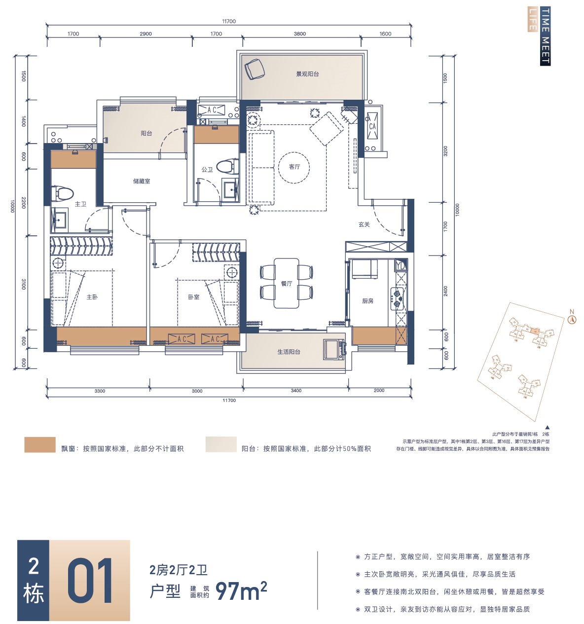 方正户型,宽敞空间,空间实用率高,居室整洁有序 主次卧宽敞明亮,采光通风俱佳,尽享品质生活 客餐厅连接南北双阳台,闲坐休息或用餐,皆是超然享受 双卫设计,亲友到访亦能从容应对,显独特居家品质